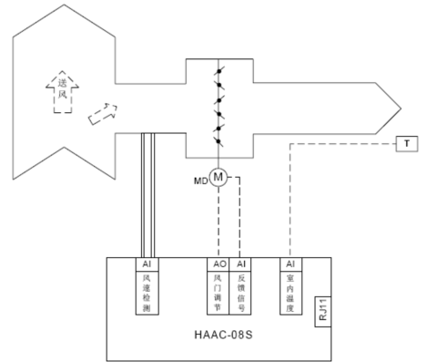 设风量传感器测量实际送风量,将之与送风量设定值比较,通过风门调节送风量