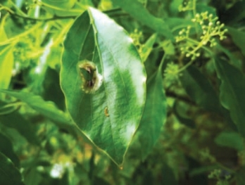 樟潜叶细蛾幼虫在叶片上下表皮内取食叶肉组织,初期形成弯曲虫道,后逐渐成蚕豆大小透明斑块,在其内排黑色粪(图2-5),属常见危害种类,虽未见严重危害发生,局部危害率也较高。