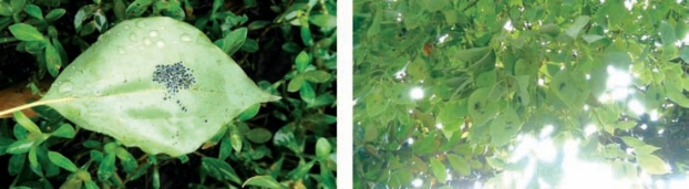 黑刺粉虱分布在香樟叶背,其危害特征明显,在树下极易观察到。危害较轻时叶背三三两两少量散落;危害较重时极像在叶背堆放上一撮撮黑芝麻,枝叶过密时,几乎每张叶片背面都有分布(图2-9)。