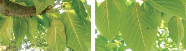 朱砂叶螨是樱属植物上的常见害虫,虫体小,一般于5月中下旬在叶背危害明显(图2-24)。苏州地区梅雨季过后,在小暑节气后迅速升温,常爆发朱砂叶螨严重危害,导致植物整株叶片发黄发红,失水严重像烘干的纸张,严重影响正常生长。朱砂叶螨同时期也严重危害桃李杏梅等其他蔷薇科植物。朱砂叶螨与梨冠网蝽对叶面的危害症状有相似之处,危害期也差不多,但对两者防治措施不同,可兼防兼治,不能错防漏防。