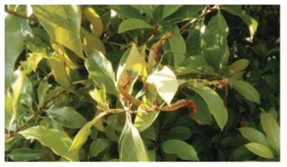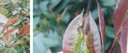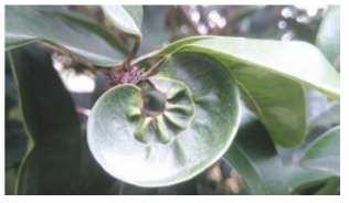 小蜡绢须野螟以4月上中旬桂花抽新梢期危害最严重,在新梢展开3~4片新叶时,幼虫在新梢顶抽丝缀叶结巢,在巢内啃食叶片,虫体小,危害大(图2-37),严重仅剩主脉(图2-38),残缺叶片继续生长,导致常见扭曲(图2-39)。危害初期即明显可见,一经发现,应立刻采取防治措施。