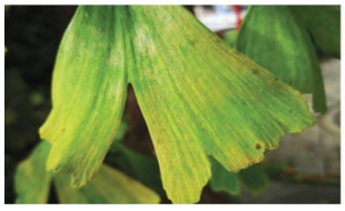 梅雨季节后,银杏树的叶面常常会泛白、发黄,一般在扇形叶面边缘,大小不一,以树冠中下层最明显。银杏树体高大,仅在整株叶面都泛白的情况下才会引起人们的关注,并且人们常将其归因于夏季持续高温引起的日灼而没有仔细察看。其实此类症状主要由茶黄硬蓟马锉吸危害所造成(图2-50)。近几年,在银杏树主干及树体周边常出现温室白粉虱(图2-51),与茶黄硬蓟马的危害基本在同一时间段发生。