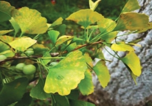 银杏叶部有多种病害,银杏轮斑病大致在梅雨前后发生,叶面出现症状最初从叶缘开始(图2-52),以衰弱衰老树为重。银杏树体高大不易防治,短时间内即整树枯黄,会导致落叶。建议杀菌剂灌根处理。