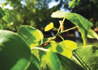 乌桕在进入花期阶段,花序及前端叶片易受杧果蚜群集危害,叶面布满蜜露(图2-91)。