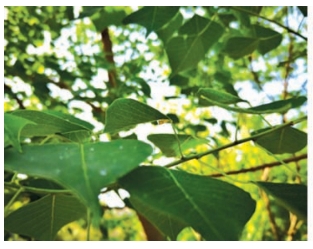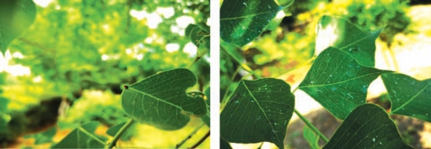 乌桕叶背、叶柄处常能发现三刺角蝉残存蜕皮(图2-93),数量较多,但难以发现虫体(图2-94),主要是因为三刺角蝉大多躲藏在叶腋处,受惊后以弹射状逃逸。同期发现木虱危害,叶面产生白色蜡丝(图2-95)。