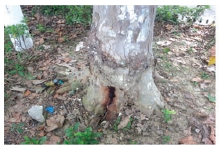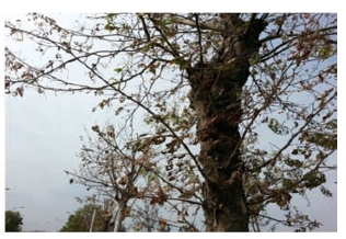 悬铃木的常见危害还有天牛(图2-98)、袋蛾(图2-99)等,其中天牛对悬铃木的危害极其普遍并且危害严重,但常因悬铃木树体高大愈合能力强,发生在枝干上的此类危害常被认为是疥癣之疾而不被重视,往往形成大量枯枝危膀,存在较大安全隐患。袋蛾爆发危害时,也常能将悬铃木整株叶片啃食光,仅残留叶脉。