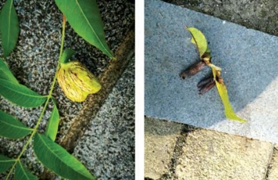 梳齿毛根蚜主要危害黄连木叶片,早春危害,在叶背形成硕大虫瘿(图2-120),外表有花纹,形似鸡冠,因此,黄连木又被称作“鸡冠木”。6月中下旬从底部破壁而出,导致大量落叶。
