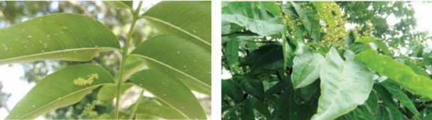 无患子斑蚜危害严重阶段是在无患子树的叶片完全展开之前,具体时间在5月中旬前后。在危害初期症状不甚明显,蚜虫密集在叶背刺吸,很快导致无患子树的叶片扭曲,不规则失绿,产生大量蜜露并诱发煤污(图2-125)。
