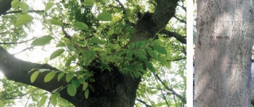 朴绵斑蚜的形态特征和危害方式有别于一般的蚜虫,主要危害朴树,一般在4月中下旬开始实施危害,危害严重时虫子布满叶片、树干,并且在朴树周边绕飞,因虫体白色,整株树体布满星星点点,异常明显(图2-133),并且引起朴树煤污发黑,严重影响景观。与大部分蚜虫不同的是,在荫蔽环境下生长的朴树,或多或少,基本上全年都会受朴绵斑蚜的危害。