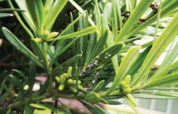 罗汉松新叶蚜不仅仅危害罗汉松新叶,而且嫩枝上也经常密布无翅蚜(图2-140),对罗汉松正常生长影响很大。