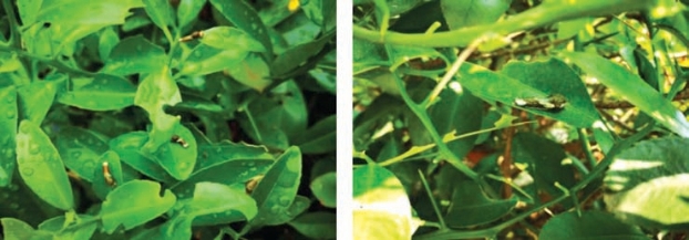 柑橘凤蝶成虫非常漂亮,常成双成对在柑橘、酸橙周边绕飞,履行着凤蝶一生“最神圣的使命”——将卵单粒散产在叶面。卵透明,形似鲫鱼卵,数量较多,幼虫很快孵化。低龄幼虫看似很呆萌,静静地趴在叶面,其实食量很大。虫体初为黄白色,逐渐花白,越长大,越类似于一坨鸟粪(图2-154)。