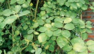每年4月,朱砂叶螨即开始在叶背危害,蔷薇属植物普遍受害严重,初期叶片失绿发黄,迅即卷曲发红,叶片发脆直至枯死(图2-164),植株生长衰弱。