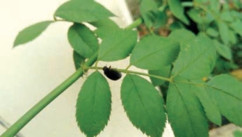 黑绒鳃金龟夜间危害,月季叶片常见有缺刻状,白天能少量遇见其在植株上活动(图2-166)。