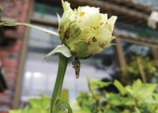 小袋蛾危害月季叶片、花蕾,图2-170中的一只虫即反映危害程度。