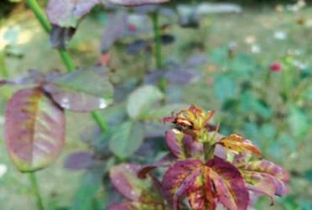 春夏过后,月季开完花后,经修剪萌发新梢,新梢顶部常有黑额长筒金花虫啃食危害(图2-178),啃食部位叶片展开后缺刻严重。该虫较活跃,像蜜蜂采蜜般啃食几口就另寻新梢,受惊后会立即高飞逃逸。