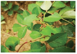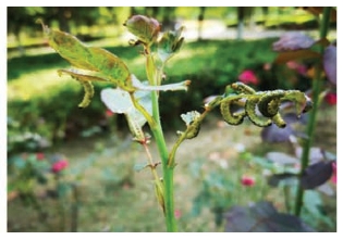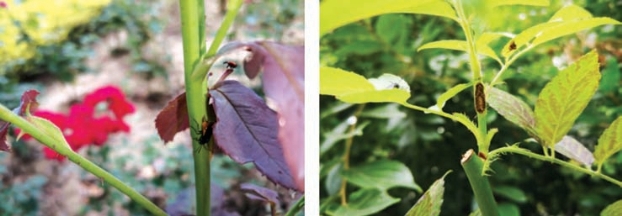 春夏之间,多种三节叶蜂危害蔷薇属植物叶片,常见月季三节叶蜂头为黑色,身体呈透明状(图2-181),玫瑰三节叶蜂头为黄色,体表有黑瘤(图2-182),两者外形相似、食性相同,虽吃相优雅,但危害严重,像战斗小分队群集而速战速决,短期内植株仅留叶柄及主脉,受惊后即掉落地面。多种三节叶蜂常混杂危害(图2-183),但发现基本上同种聚集,分片危害。成虫一般飞行缓慢,在嫩枝上产卵,用产卵器切开嫩枝表皮,缓慢前行,植株伤口快速褐变,卵孵化时植株伤口炸裂(图2-184)。