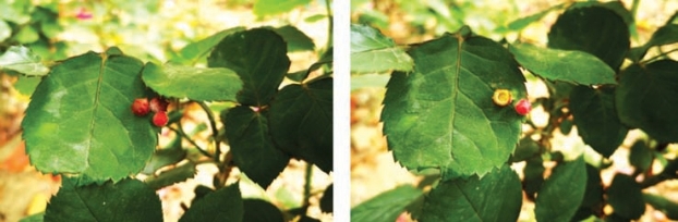 月季叶面小脉部分常见一至多个黄豆大小的颜色鲜艳红色的小球体(图2-188),极像手雷,一般为瘿蜂产卵刺激月季叶面细胞快速分裂增长形成,内有蛆状幼虫一条。一般并不影响月季正常生长,也无法评价其对景观有多大影响。