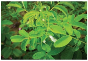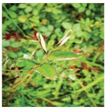 蔷薇属植物均受蔷薇瘿蚊危害严重,新叶未展开前蔷薇瘿蚊在叶面危害,导致叶片不能完全展开,叶缘部分对接,呈饺子状,叶面有白色霜状(图2-189、图2-190)。