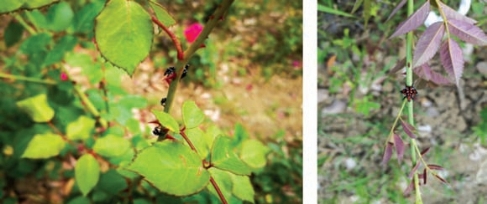 斑衣蜡蝉在月季、蔷薇嫩枝上数量较多(图2-191),刺吸危害,如遇见其群集危害,则须及时防治。