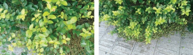 金叶女贞被弃用,罪魁祸首当属于金叶女贞叶斑病,危害严重地块在梅雨来临后病斑扩大,迅速加重,开始出现大量落叶(图2-193),在夏季高温期间新芽萌发困难,植株长势逐渐衰弱。金叶女贞叶斑病危害严重的原因,一是缺乏对植物病害“防大于治”的观念,金叶女贞叶斑病自危害初期到梅雨季来临前无明显症状,人们一般疏于防治,凡发生叶斑病的地块,在早春萌芽展叶初期即应均匀喷洒保护性杀菌剂,并根据上一年严重程度制订定期防治计划;二是过度养护造成,金叶女贞耐修剪,但人们对修剪程度“放”与“缩”缺乏目标计划,过于频繁地修剪生长点,对植物内源激素更多的是伤害而不是刺激,植株生长衰弱,易受病菌入侵。只要认真制订防治计划并实施有针对性的重点防治措施,是完全可以控制金叶女贞叶斑病蔓延的。