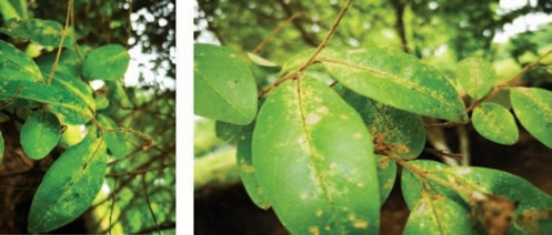 图2-202 小叶女贞上的女贞高颈网蝽危害状