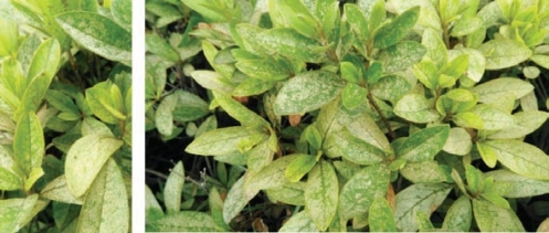 杜鹃冠网蝽是锦绣杜鹃的主要虫害,苏州地区1年5代左右,花后期杜鹃冠网蝽开始在叶片背面少量刺吸危害,叶面点状失绿。在5月上中旬开始大量实施刺吸危害,叶背黏附黑色点状排泄物,叶面泛白(图2-219),严重影响锦绣杜鹃叶片的光合作用能力。杜鹃冠网蝽在危害初期明显易辨,一旦危害则不可逆,公共绿地中鲜见防控到位的锦绣杜鹃,其根源全在于喷洒作业不到位。
