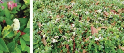 杜鹃叶肿病也称饼病,与杜鹃瘿瘤病症状相似,属真菌性病害,一般在4月中下旬花后期锦绣杜鹃开始出现顶梢部分叶片卷曲皱缩,发生严重时周围所有叶片都卷曲皱缩(图2-220),严重影响锦绣杜鹃的生长。随着温度升高及降雨增多,受害叶片卷曲部分发黑、腐烂,严重影响景观。