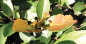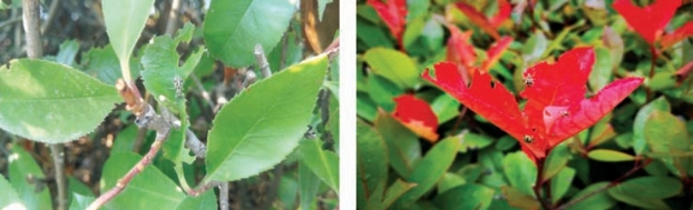 红叶石楠上目前发现多种象甲危害,茶丽纹象甲成虫啃食叶片,2015年仅局部区域在树篱中下层少量发现,从老叶叶缘开始,大部分危害状如鱼骨(图2-229),严重危害仅留叶主脉。5月下旬、6月上中旬危害严重,茶丽纹象甲白天大多潜伏不活跃,虫体不大,虫体颜色与老叶相近,不易被发现。随着危害普遍,中上层新梢红叶也渐趋危害严重,尤其白天在红叶上堂而皇之群集啃食危害,异常突出。二带遮眼象危害状大致与茶丽纹象甲相同,在红叶石楠上发现,以危害嫩叶为主(图2-230)。