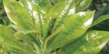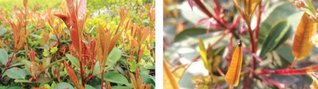 切叶象近年危害红叶石楠、光叶石楠普遍且渐趋严重(图2-231、图2-232),前几年人们常发现老叶叶面有米粒大小孔洞,在多数情况下却查找不出危害源,而错过防治时机。在红叶石楠新梢抽出但叶片尚未展开时,切叶象在叶片之间常群集啃食危害,因新梢、新叶直立聚合而不易被发现危害。红叶石楠危害处呈黑色易观察到,当新叶展开后叶面满布孔洞,严重危害会导致叶片扭曲,近年其严重危害同样会造成叶柄断裂后大量落叶。