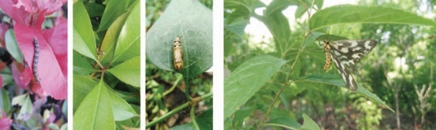 小蜻蜓尺蛾主要危害蔷薇科植物,在苏州地区,其明显危害是2015年在桃树、火棘上首先被发现的。目前,在红叶石楠上出现小蜻蜓尺蛾危害已随处可见(图2-233),但在其他植物上出现的暴食危害现象在红叶石楠上不明显。资料显示,小蜻蜓尺蛾1年1代,以蛹越冬。通过现场观察,4月下旬,小蜻蜓尺蛾幼虫便在红叶石楠上开始危害,在5月上中旬化蛹,成虫在5月底、6月初大量羽化,集中在蔷薇科植物周边低飞,野外未见到卵。小蜻蜓尺蛾老龄幼虫食量大,属于暴食危害的种类,在红叶石楠上的发展趋势必须引起足够重视。