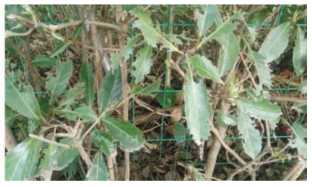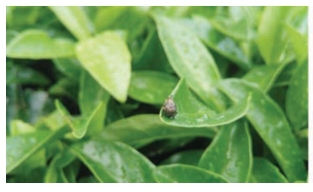 日本珊瑚树中下层叶片边缘常常受二带遮眼象啃食危害(图2-255),症状明显,缺刻成鱼骨状(图2-256),影响景观。