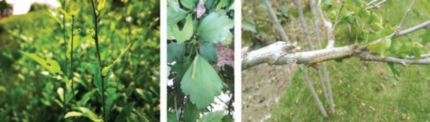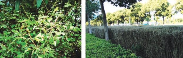 超桥夜蛾低龄幼虫食量大,在新梢嫩叶处危害,拟态性强,危害木槿、木芙蓉隐蔽,难以发现虫体。老熟幼虫与木槿枝干同色(图2-263),常常暴食,其危害过的木槿上也很难一眼就发现幼虫,防治时机应把握在新梢顶部新叶被取食呈光杆时(图2-264)。