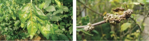 木芙蓉或木槿植物的枝叶上有时会零星发现其他未知危害(图2-268),严重影响植株正常生长,有时还导致植物死亡。