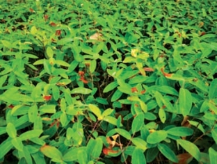 金丝桃叶片柔软,进入夏季易受日灼危害,褐斑病是常见叶片病害,一般从叶尖开始出现铁锈色病斑,颜色较艳丽,严重时叶面呈一片火烧状(图2-277)。