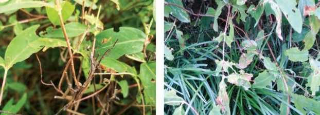 金丝桃枝条柔弱,叶片圆整,从叶片及叶缘鱼骨状危害状寻找虫源,会发现大灰象虫、二带遮眼象两种象甲危害,受惊后即跌落地面装死,近地面叶片及叶缘被啃食严重,叶片缺刻残破不等(图2-280),严重影响景观。