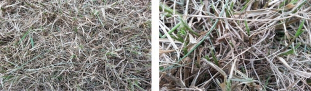 淡剑袭夜蛾是暴食危害的害虫,苏州地区1年5~6代,第一代在5月中下旬至6月开始实施危害,危害不是特别明显。从8月中旬开始,因世代重叠,不同区域常发生暴食危害现象,幼虫大量啃食草坪导致草茎叶折断,产生大量草屑,常使草坪枯黄一片(图2-293)。淡剑袭夜蛾实施暴食危害时,并不啃食草坪内禾本科杂草及其他阔叶杂草,低维护水平的草坪经过淡剑袭夜蛾暴食过后,形成一块块斑秃,极度影响景观。淡剑袭夜蛾幼虫夜间取食,白天躲藏在植株根部或浅土中,其低龄幼虫食量不大。这也常常是对淡剑袭夜蛾虫害观测容易疏忽、防治容易滞后的根本原因。