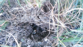 麦冬为肉质根系,并会形成小块根,为金龟子幼虫蛴螬提供丰富良好的生存食材。一旦温度适宜,蛴螬即在根部啃食危害。初期麦冬呈一簇一簇枯死,严重危害时成片枯死,无须用力,随便一拎即可将山麦冬拔出,常可见蛴螬虫体(图2-303)。
