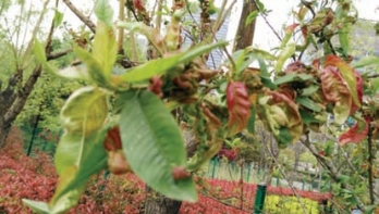 桃病虫危害实在多,此处简单介绍桃缩叶病。桃缩叶病危害严重时,常导致整株叶片高度皱缩扭曲,并引起大量落叶(图2-320)。