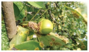 桧柏-梨锈病是梨及木瓜海棠、贴梗海棠等木瓜属植物重要病害,是一种转寄主的病害,离桧柏越近,发病越重。惊蛰后雨水增多,桧柏上冬孢子角吸水膨大(图2-321),转主危害木瓜、梨等植物果叶。危害初期叶面呈针尖状黄色斑块(图2-322),即使及时控制,叶面也会留下黑色僵斑块,严重危害时果、叶、叶柄等凡是绿色的部分均布满毛刺(图2-323),极其恶心。