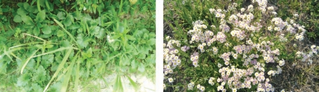 一年蓬(图3-18),整个上半年都能看到这种杂草那漂亮的花儿,与之特征相似的还有春飞蓬,植株在营养生长阶段都是贴地生长,生殖生长阶段植株能高达1 m,招蜂引蝶很具观赏性,有时会被误认为是栽培植物。