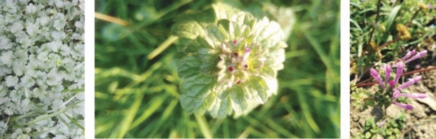 宝盖草(图3-38),常见越冬草,成片生长,花型漂亮,适合生长于光弱环境下,茎叶淡绿,蔓生。