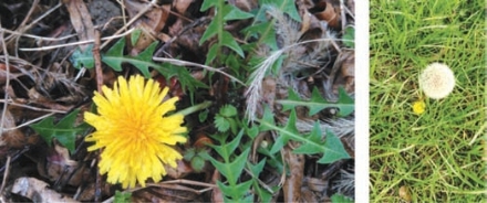 蒲公英(图3-65),著名中药或野菜,同属近似种较多,株型差异大,植株低矮,贴地生长,部分种混生在草坪中,不到花期不易发现其植株,均是由其瘦果聚合成球状而出名。