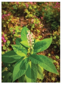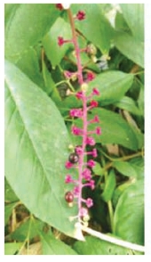 垂序商陆(图3-75),绿地中常见的大型亚灌木状杂草,茎叶粗壮、肥大、草质,花果下垂、色艳,其相近植物商陆也比较常见(图3-76)。
