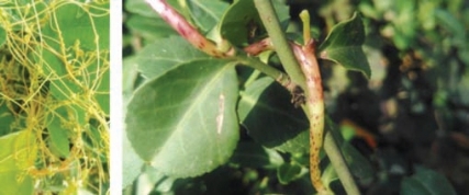 菟丝子(图3-84),常见危害最严重的寄生植物,没有根系,靠吸收寄主植物的营养,正常生长发育,靠种子繁殖。
