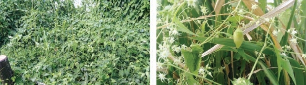 儿狭长,瓜型相比略大,在水湿环境下生长旺盛,水边种植的乔灌木均能爬满,旱地一般生长不良。